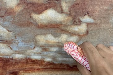 Add more thinned paint to darken shadow shapes further. Then, by rubbing out and removing some amount of paint with a cloth, introduce contrast and softness, especially in the lighter masses – this enhances the painting's 3D illusion.